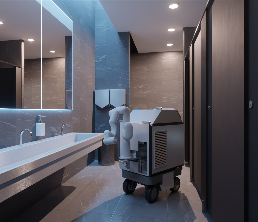 Robot cleans the floor area below toilet bowl and urinal while arm cleans the respective object. It also dries the floor before leaving the spot increasing usability of washroom.
